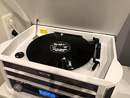 - PLATTENSPIELER: Unter dem klappbaren Holzdeckel wartet ein riemenbetriebener Plattenspieler mit drei Wiedergabegeschwindigkeiten darauf, eingestaubte Vinyl-Sammlungen wieder zum Leben zu erwecken und zusammen mit Ihnen in Nostalgie zu schwelgen.