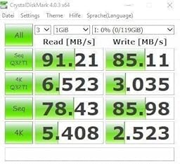 Resultat: Schreiben: 85,11 MB/s Lesen: 91,21 MB/s